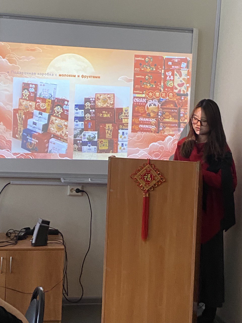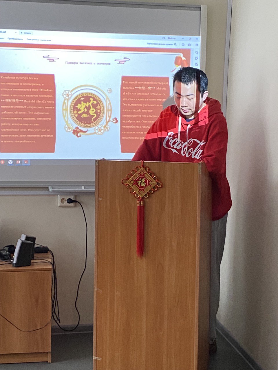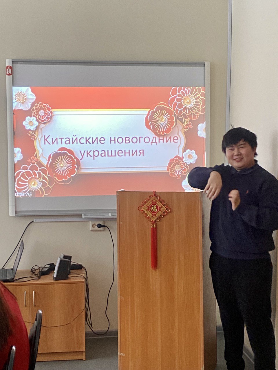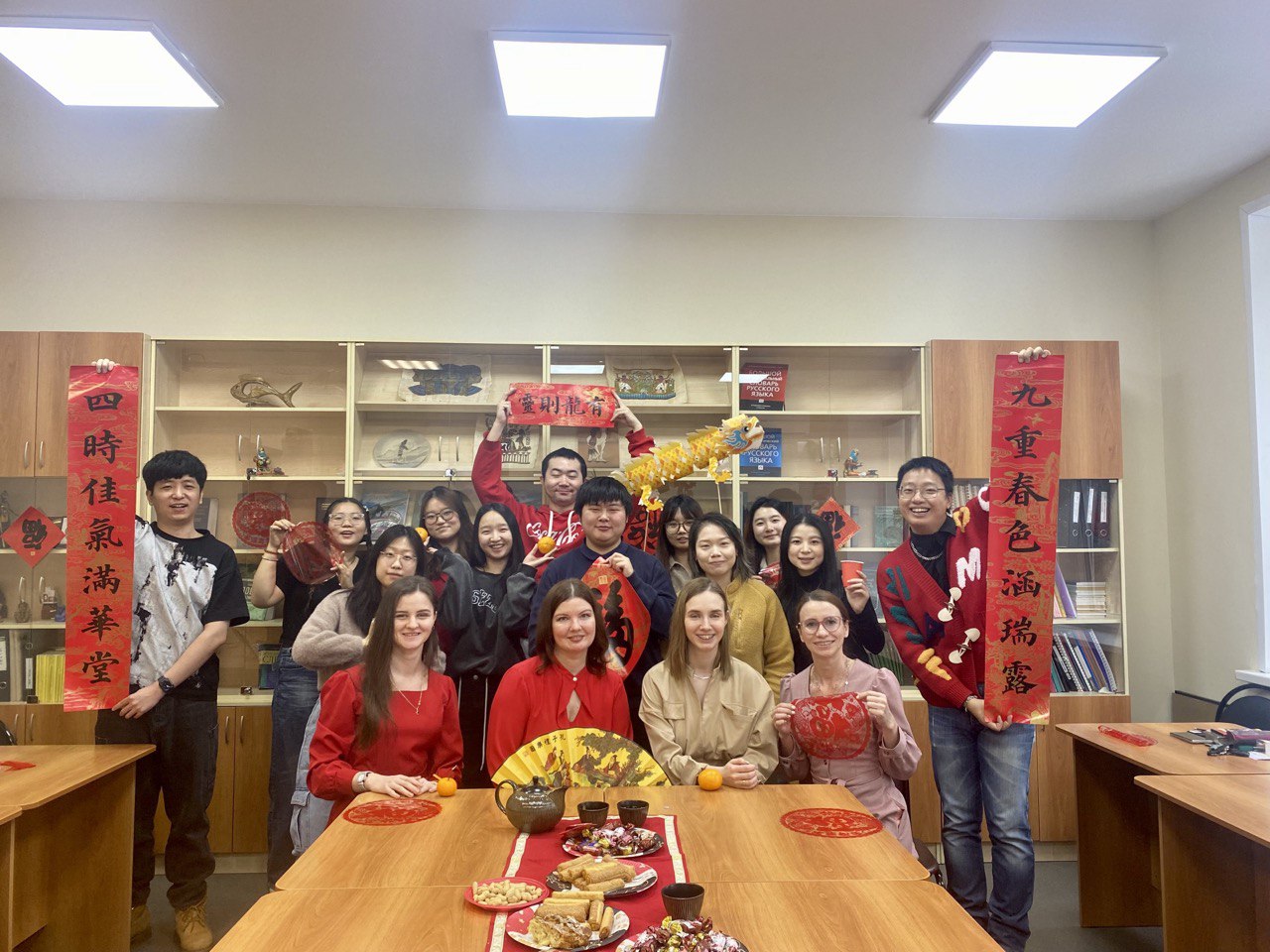 قام وانغ زيبين، فان شينغيو، لين بينغشوان، هو جياشين، تسوي غوي فنغ تحت إشراف مساعدي القسم ن. ف. زاجومينيكوفا، ك. أ. ميتورنيكوفا، أ. أ. خبيبولينا بإعداد عروض وتقارير ملونة عن الملابس الاحتفالية الصينية، مطبخ وتقاليد السنة الجديدة. وقدم ليو جونشن تقريرًا عن صورة الثعبان (رمز عام 2025) في الثقافة اللغوية الصينية. في نهاية العيد، تبادل جميع المشاركين التمنيات الطيبة لبعضهم البعض.